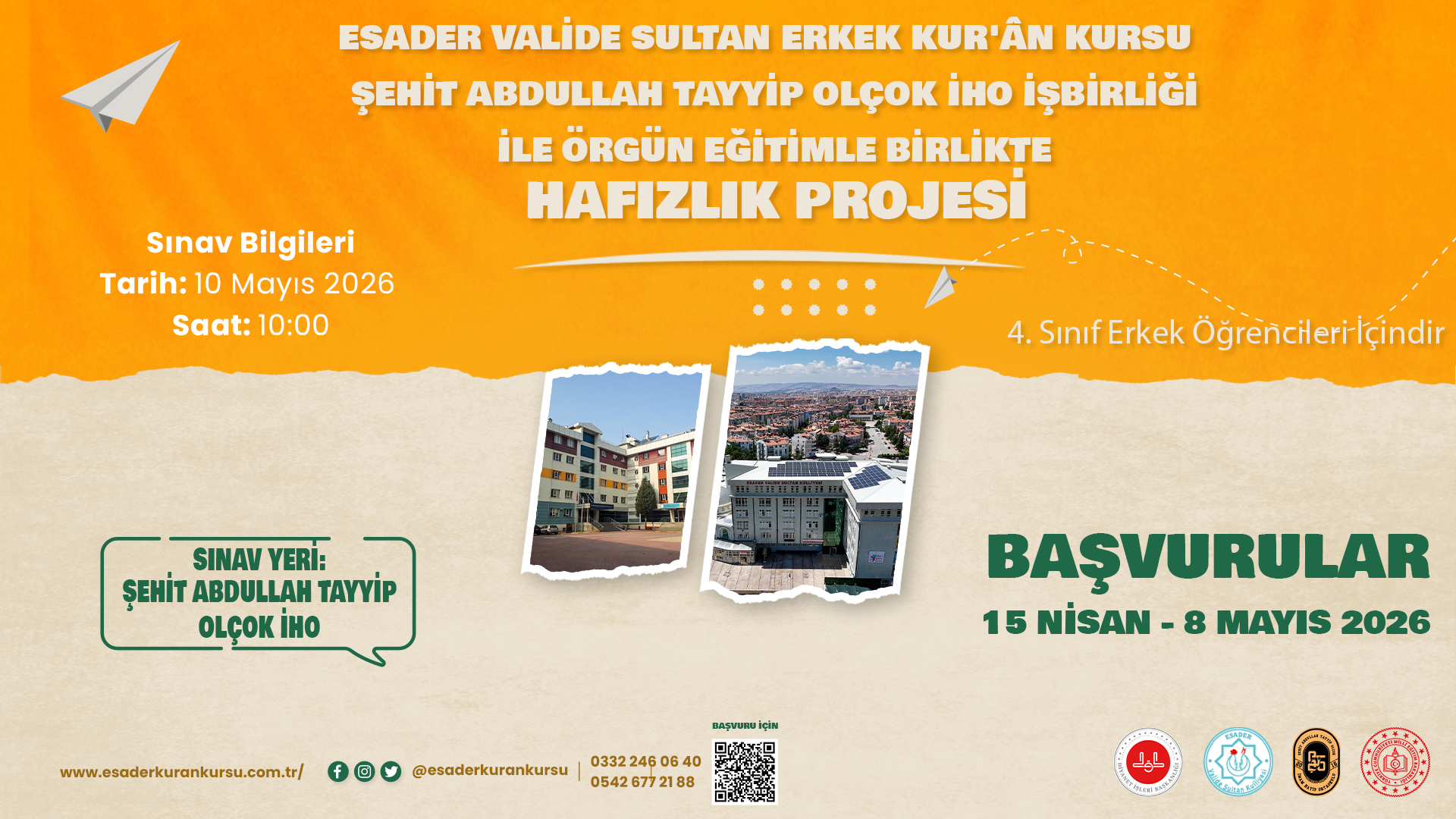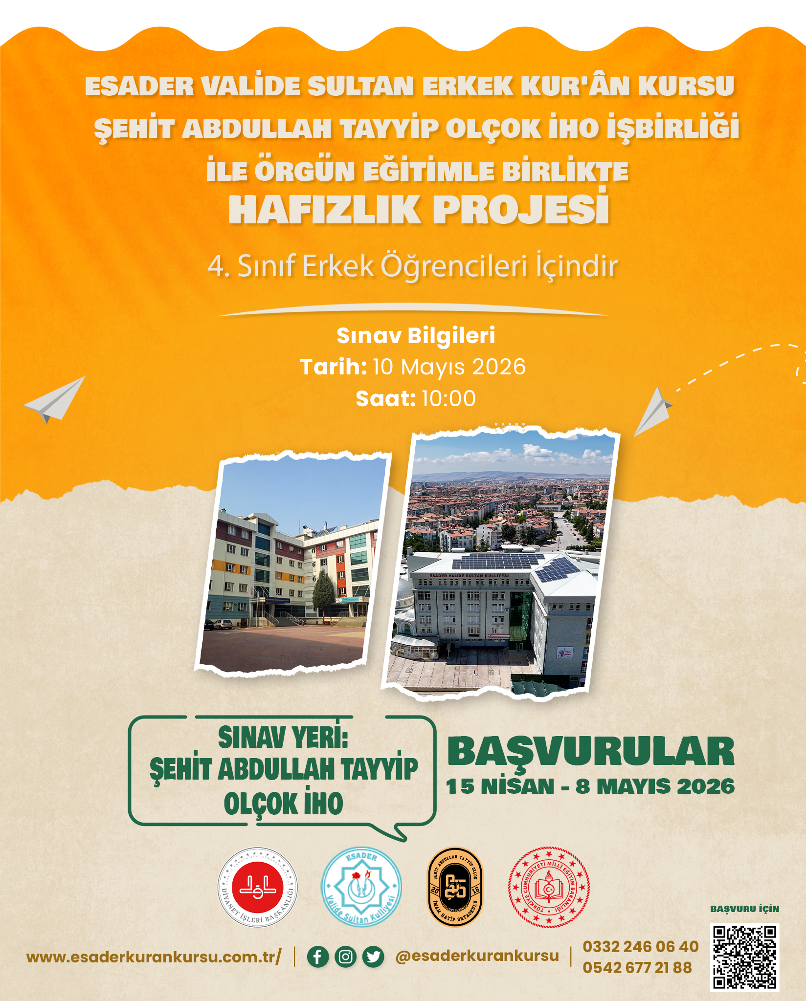 ESADER Valide Sultan Erkek Kur’ân Kursu ve Şehit Abdullah Tayyip Olçok İHO işbirliği ile örgün eğitimle birlikte hafızlık projesi sınav duyurusuna çıkıldı.